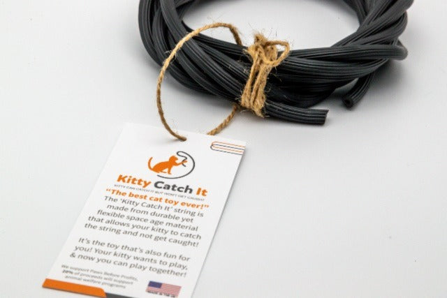 The "Kitty Catch It" string is made from durable yet flexible space age material that allows your kitty to catch the string and not get their claws stuck.